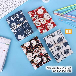B6可愛い布製リフィル・6穴システム手帳。■柄・カラー:猫柄・ブルー、猫柄・ホワイト、元気満々柄・ブラック、招き猫・レッド。■サイズ・カバー:高さ200mm×幅140mm(B6)。・リフィル:高さ182mm×幅128mm(B6)...