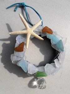 玄関のドアやお部屋のインテリア、カーアクセサリーなどシーグラスがデコレーションされた手作りリースです