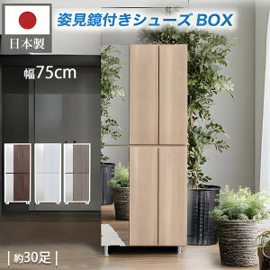 シンプルな日本製シューズボックス 外出時の身だしなみチェックが出来るミラー付き 約32足収納可能