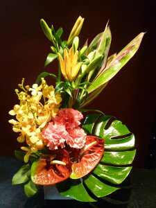 サイズ:横25~40cm ×高さ50~100cm (サイズは目安です。花材や商品で異なります。) 器は変更になる場合がございます。 花材:画像を元に色、イメージでお作り致します。 雰囲気は崩さず制作いたしますが、 入荷状況で花材変更が...