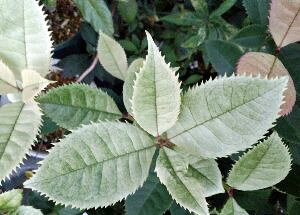 斑入り葉ピラカンサス バラ科 半常緑低木 5寸鉢植え、高さ20センチ内外 春先の芽だしの頃はピンク色の外斑が入り美しい品種です。 開花時期:5月〜6月頃 寒さに当たると真っ赤に紅葉します。