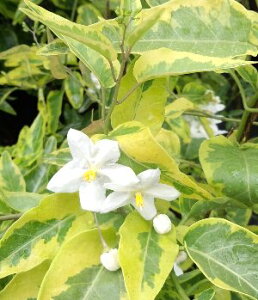ヤマホロシ 斑入り葉白花(10.5センチポット苗) ナス科ナス属 半つる性 別名:ツルハナナス・ソケイモドキ・ソラナム・やまほろし 開花時期:5月〜10月ごろ ■管理のポイント とても丈夫で育てやすい植物です。 夏に涼しげな花を咲か