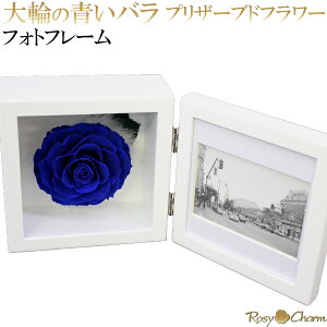 大輪の青いバラ1輪|フォトフレーム 【写真立て】薔薇のプリザーブドフラワーギフト 上品な白い木製フレームに、直径約9〜10cmもの特大サイズの【青いバラ】をアレンジした豪華な写真立てです。 ブルーローズは、花びらが肉厚なベルベッ