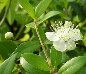 communis フトモモ科 地中海原産 晩秋に黒斑点の入る白実に熟した果実は食用になります。 ギリシャ時代なでに花が結婚式