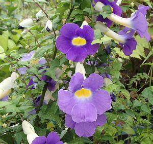 ツンベルギア エレクタ 別名:木立ヤハズカズラ(コダチヤハズカズラ) 9cmポット、高さ10cm、半つる性 管理のポイント 冬場は多少寒さに弱く温度は最低5℃以上保って下さい。 肥料は多目の方が良く育ちます。 光線を好むので良く日に当