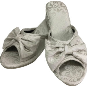 中世ヨーロッパを思わせるようなデザインが人気のブランド「ジェニファーテイラー」 そんなジェニファーテイラー社製の生地を使用した高級感漂うヒールスリッパは、 4cmヒールのタイプで美脚効果のある商品です。 脚のシルエットが美し