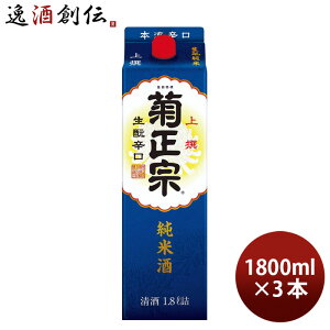 菊正宗 上撰 生もと純米 紙パック 1800ml×3本。容量/入数 1800ml / 3本 Alc度数 15%。原材料 米・米麹。日本酒度 +5。