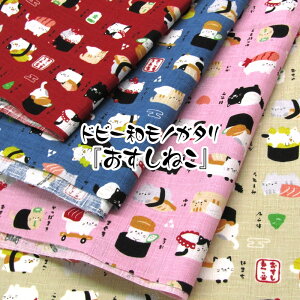 お寿司のシャリになったネコちゃんがたくさんのプリント生地。 まぐろ、サーモン、いくらなどの姿になった可愛らしいネコちゃんがいっぱい♪ 見ているだけでホッコリと癒される楽しいデザインです。 素材は綿100%のドビー...