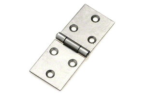 【※丁番類は全サイズ共通写真を使用している場合がございます。中にはサイズによってビス穴の数が異なる物もございますので予めご注意ください。】 鉄製の軽量扉用横長丁番です。 定番の鉄薄口丁番と比べると、板材が厚く強度が高くなっていま