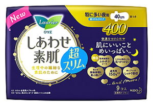 リニューアルに伴いパッケージ・内容等予告なく変更する場合がございます。予めご了承ください。 名 称 ロリエ しあわせ素肌 超スリムタイプ 特に多い夜用 400 羽つき 内容量 9個 特 徴 ◆生理中の繊細な素肌のために。肌にいいこ