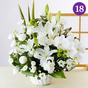 商品情報 使用花材 白菊(中輪菊、スプレー菊、ピンポン菊のいずれか使用)他の花は淡い色のお花を使用この商品には白ユリがはいります サイズ 高さ 約55cm横 約30cm 無料特典 メッセージカード・名札ラッピングお手入れの仕方...