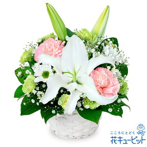 ■【お供え・お悔やみの花】お供えのアレンジメント アレンジメント/ワンサイド 5390 円(税込)凛とした白ユリを中心に、あたたかみのあるピンクの花を添えたお供えのアレンジメント。柔らかな雰囲気の花々が、故人との思い出に優しく