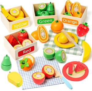 充実の34ピースおままごとセット: 本物そっくりな果物24ピース(12種類)、ナイフ2本、お皿2枚、プレイマット2枚、収納ボックス4個の豪華セット。鮮やかな4色に分かれた果物は、高品質な木材と丈夫なマジックテープで作られ...