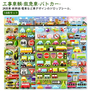 工事車輌・救急車・パトカー・消防車・新幹線・電車など車デザインのドロップシール。【18枚セット】【立体的なデザイン】ぷっくりとした立体造型が可愛いPVCシール! 指で触れるたびに感じるふくらみと、色あせない鮮やかさが特徴です