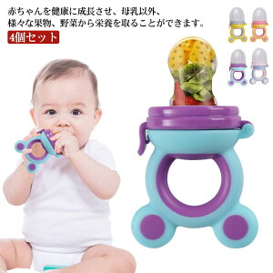 赤ちゃんが自分で食べる力を育てる離乳食フィーダー。2枚フードフィーダー、2枚落下防止ホルダーの4点セット 柔らかいシリコンサックはカミカミしたい赤ちゃんにぴったり。カミカミすることであごへの運動を増やし、「吸う」から「噛