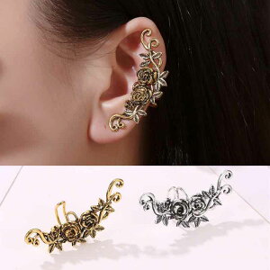 シルバーメッキとゴールドメッキした大きなバラの花と絡まる蔦をモチーフにした面白いイヤーカフ。 どんなスタイルにもマッチしてくれるおしゃれなイヤカーフは男の人からも女の人からも人気のアクセサリー。 まるでリングピアスやフ