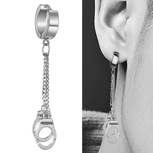 サージカルステンレス316L製のリングピアスに喜平チェーンで2個の手錠のチャームが揺れるSM風の面白いステンレスピアス。 2連の長いキヘイチェーンの先端に手錠のチャームが存在感をアピールしてくれる男性からも女性からも人気のリング