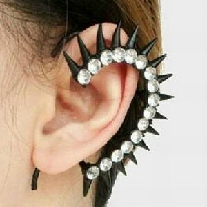 黒色にブラックメッキされたトゲトゲのスパイクにクリスタルのジルコニアをセットしたパンクロックな大人のイヤーフック。 結婚式や入学式、成人式やウエディングジュエリーとしても使えるピアスホールのいらないイヤリングタイプの黒
