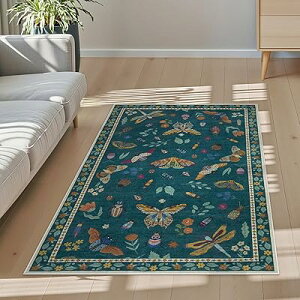 ラグ 洗える 約1畳 90х150cm 薄手 カーペット モダン ふわふわ 滑り止め 防音 抗菌防臭 リビング ダイニング ラグマット オールシーズン適用 花 蝶 トンボ 昆虫 動物柄 ダークグリーン...