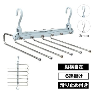 ■縦掛け/横掛け両用の6連スラックスハンガー。■縦掛けで収納スペースを約80%節約。■横掛けでゆったりと見やすく出し入れ簡単。■幅広設計でズボン以外の衣類も収納可能。■洗濯物を干して、乾いたらそのまま収納可能。