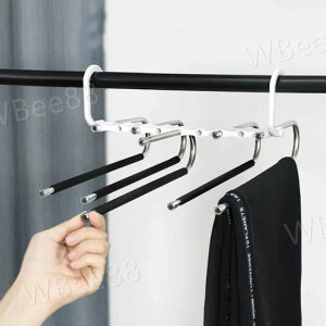 5連ズボンハンガー!「多機能」水平および垂直の二つの使い方があり、水平に吊るすのは干しに適します。「省スペース」5連折り畳み式のデザインによって、空間を最大限に利用できて、ズボンが同時に5つ収納可能となります。散らかした