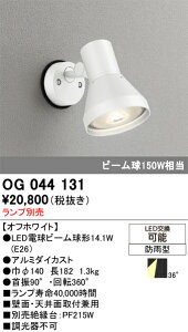 OG044131OG044131ビーム球形LED・ビーム球別売屋外灯 スポットライト LED 自動点灯無し電気工事必要 畳数設定無し白熱灯首振角度:90度 回転角度:360度 径φ140 長182 吊高125製品重量:1.3Kg●アル...