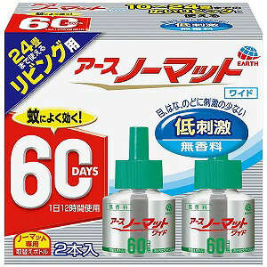 リニューアルに伴いパッケージ・内容等予告なく変更する場合がございます。予めご了承ください。 名 称 アース製薬 アースノーマット ワイド リビング用 取替えボトル 60日用 無香料 内容量 45ml×2本 特 徴 ◆広いリビング用のア
