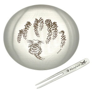 すっきり涼やかなステンレス製丸皿とかんざしフォークのセットです。デザインも相まって、わらび餅や大福など和菓子にぴったり。藤棚を眺めるダヤンの柄は、レーザー刻印です。 素材:ステンレス鋼18-8 丸皿サイズ:約Φ118mm フォーク