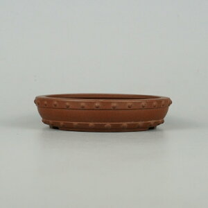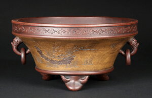 サイズ:口径29.6cm高15.5cm 商品解説 50〜60年ほど前に焼成されたと思われる作品。紫泥の胎土に白泥土が付けられ、釘彫彫刻や耳環細工などが施された大変凝った作品。おそらく宜興で急須を主に手掛けていた窯元の作品で、盆栽鉢に精通し