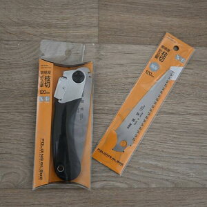 道具は 国産の老舗が 製造 日本製です のこぎりと替刃セットです 折込式の枝切用鋸です。鋏などでは剪定できない枝にご使用ください。 替刃式なので切れ味が落ちた時には刃を交換できます。刃渡り 約120mm 板厚 0.7mm