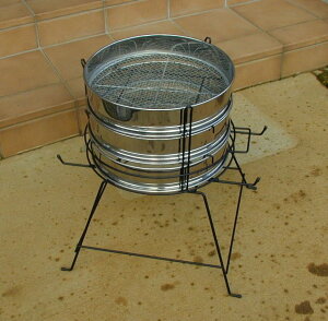 その1 スタンド本体に直径37cmのフルイ枠3個と 3・5・7mmの替え網が付きます。 その2 希望のサイズのアミをセットしてフルイを重ね土を入れて フルイを前後にスライドさせるだけ その3 1度に4種類の粒度の土が篩い分けされます。