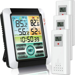 【室内屋外兼用三個子機センサー】:室内にいるながらにして、室内の温度と湿度だけでなく、屋外の温度と湿度がチェックでき、とても便利です。子機センサーから親機に測定結果を送信できる距離は見通しの良いところで約100Mです。子機