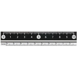 ハイコントラストで視認性の良い定規。コントラストが強いため文字とメモリの視認性が高い。5cmごとの大きな数字で視認性が良い。矢印付きメモリなので線を引くときに読み取りやすくなっています。
