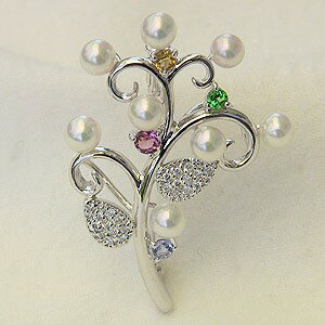 カラフルに4色の宝石が輝き4ミリのベビーサイズのあこや本真珠と組み合わされたマルチカラーのブローチです。葉のモチーフ部分にはダイヤモンドを敷き詰めてゴージャスさもあります。洋服の襟元胸元だけでなく、カバンや帽子ストール