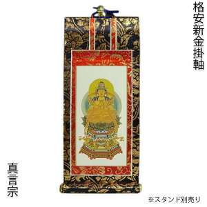 掛軸上新金は、日本製の掛軸です。 厚紙に本紙と呼ばれる仏様が描かれた紙を貼り、その周りを赤と紫の布で表装しています。 京都で一つ一つ手作りで作られています。 ご本尊と両脇侍の...