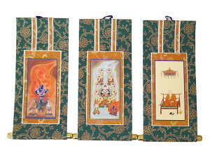 付属の鋲・フックで簡単に設置ができる掛け軸です。 細微に描かれた「大日如来像」「弘法大師」「不動明王」の色彩豊かな尊い仏様。仏画を縁取る落ち着いた茶色の表装と、金色模様が織りなす美しさは、仏壇タイプを問わない調和のとれ