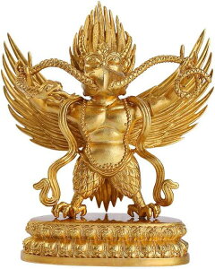 説明 【迦楼羅(カルラ)】 インド神話に登場する炎に包まれた聖なる鳥・ガルダが前身とする仏教の守護神とされています。ガルダは鳥類の王で、口から火を吹き、毒蛇(龍)を食べ神様の乗り物とされていました。 仏教において、毒蛇