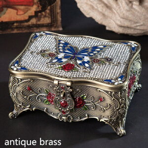 【antique brass】Antique Brass Blue Red Zinc Alloy Trinket Box With Embossed Rose Flower Leaves Branch And Butterfly Te...