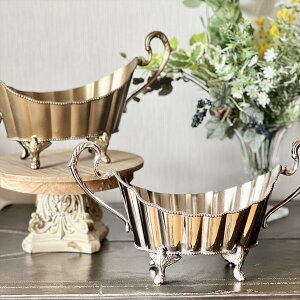 ゴールド シルバー サイズ(cm) 35×14×高さ19 材質 真鍮 商品説明 ヨーロッパのアンティークを思わせる、優雅な曲線と装飾が魅力の真鍮製コンテナ。 重厚感のあるボディと、両サイドに伸びるクラシカルな持