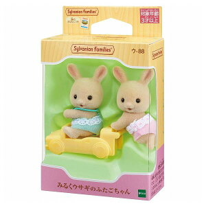 【商品特長】シルバニアファミリーのみるくウサギのふたごちゃん(おすわり、はいはい)と、手押しぐるまのセットです。 人形の頭は動かすことができます。手押しぐるまにはふたごちゃん(おすわり)を乗せられます。ふたごちゃん(