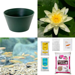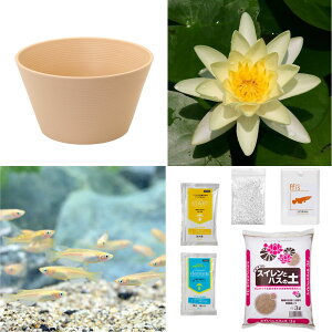 プロが考えた睡蓮鉢で育てる!プロが考えた睡蓮鉢で育てる(ベージュ) 温帯性スイレンひめだかセット 黄 説明書付特長●おしゃれな睡蓮鉢で育てる、温帯性品種スイレンとメダカのセットです。●土や栄養素、カルキ抜きなどもつい