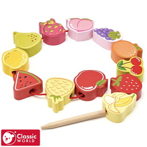 果物の形をしたビーズを使うひも通しです。 ひも通しで各ビーズを通す動作は、指先の器用さの発達を促します。 また、順序やパターンなど、 一定の法則やものに秩序があることを理解することに役立ちます。 果物の名前と形を大人と一緒