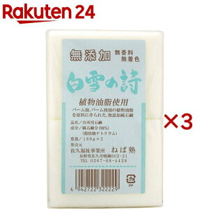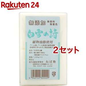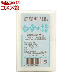 180g*2個入)【白雪の詩の商品詳細】●パームバージン油だけを原料に中和法で作った純粋な石鹸分だけを機械練りにて無添加で仕上げた名前のとおりの真っ白な石鹸。●もちろん色素、香料、エデト酸などの添加物は一切使