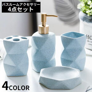 インテリアにもオススメのオシャレなデザイン♪ セラミック製のバスルームアクセサリー4点セットです。 【セット内訳】 ・ソープディッシュ ・ディスペンサー ・歯ブラシホルダー ・小物入れスタンド ※6点セットも販売中です...
