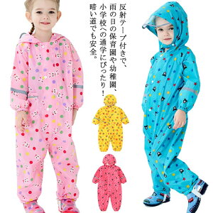 突然の雨にも濡れないおしゃれなキッズ用レインコートです。長袖・長ズボン・フード付きで全身を雨からしっかり守ってくれます! 脱ぎ着しやすいファスナーの前開きで、袖と裾にはゴムが入っています。 フードが大きめで透明ツバが雨
