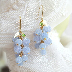 【サイズ】全体約:縦2.5cm葡萄約:縦2.5、横2cm 【素材】金具:メッキ石:プレシオサ 【デザイナーからのコメント】 フルーツシリーズに葡萄コレクションが仲間入り♪ お砂糖が付いた甘いキャンディみたいな可愛いビーズと葉っぱで葡萄を