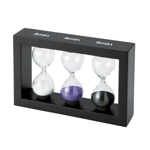 シンプルでお洒落な砂時計 ●3分と5分が同時に計れます。 ●白と黒の落ち着いた色合いで、キッチンやリビングなどいろいろな所でお使いいただけます。 ●フレームに固定されているので安定感があります。 ●はっきりと見やすい時間表示