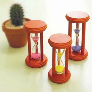 1分計・3分計・5分計のガラス砂時計が赤茶色の木枠におさまったシンプルな砂時計。 高さは約10cmで卓上に置いて邪魔にならないサイズの砂時計。 砂の色はイエローが1分計、ピンクが3分計...