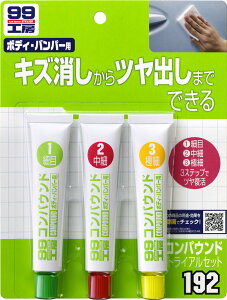■商品概要内容量:25g×3種類■詳細説明迷わない、間違わない!3種の番手をセットにしたトライアルセットです。ペイント補修の仕上げから小キズ消しまで、幅広くこのセットで塗装面のトラブルに対応できます。番手ごとに色分けしている