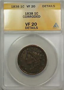 1838 Large Cent 1C Coin ANACS VF 20 Details Corroded (A)商品について売主メモ「VF 20」認証:ANACSグレード:VF 20発行年:1838年流通/非流通:流通鋳造タイプ:ビジ...